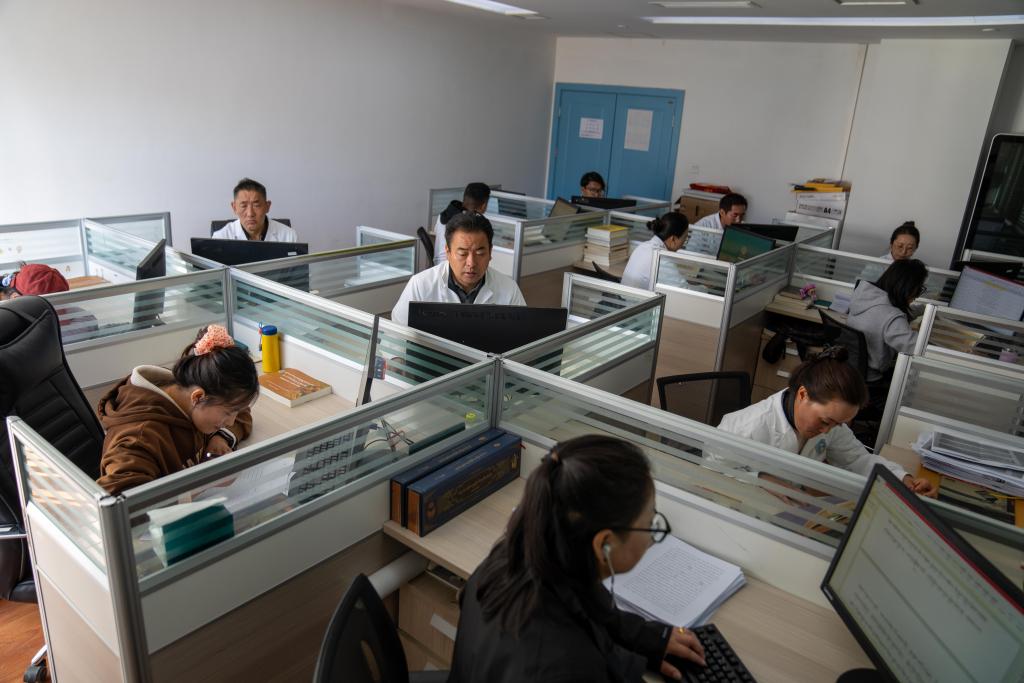 藏醫(yī)藥與天文歷算數(shù)字化資源中心的科研人員在錄入數(shù)據(jù)(10月17日攝)。新華社記者 旦增尼瑪曲珠 攝