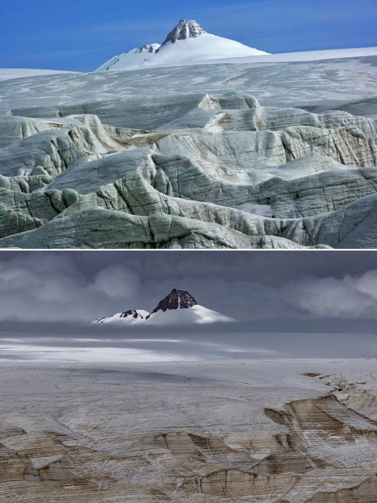 拼版照片:上圖為2009年6月拍攝的普若崗日主峰(新華社發(fā) 車剛攝);下圖為2024年9月4日拍攝的普若崗日主峰(新華社記者姜帆攝)。對比可以看出普若崗日主峰下的冰原消融嚴重。新華社發(fā)