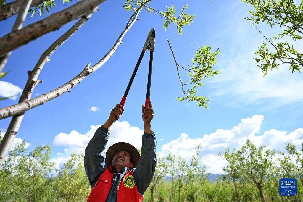 在雅江北岸南木林生態(tài)示范區(qū),當(dāng)?shù)刈o(hù)林員在修剪林木(2024年9月1日攝)。新華社記者 孫瑞博 攝