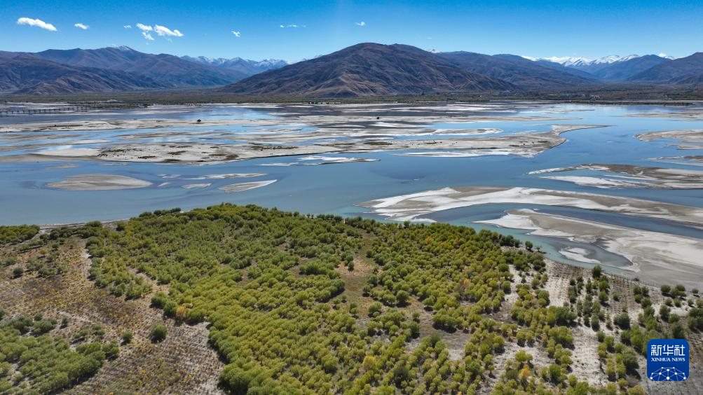 這是雅魯藏布江寬闊的河床和岸邊種植的樹木(2024年10月24日攝,無人機(jī)照片)。新華社記者 晉美多吉 攝