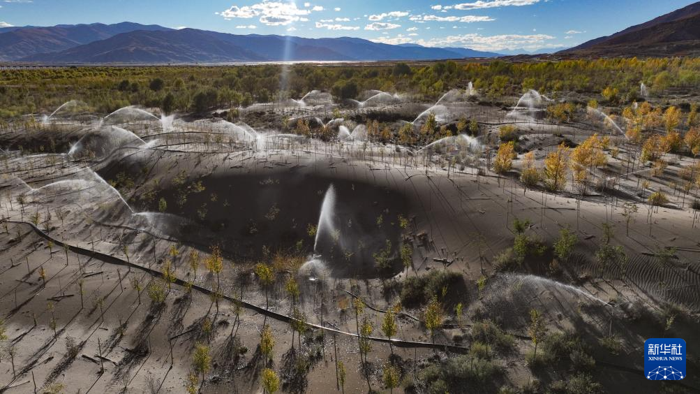 在雅魯藏布江畔,自動灌溉設(shè)備給樹木澆水(2024年10月24日攝,無人機(jī)照片)。新華社記者 晉美多吉 攝