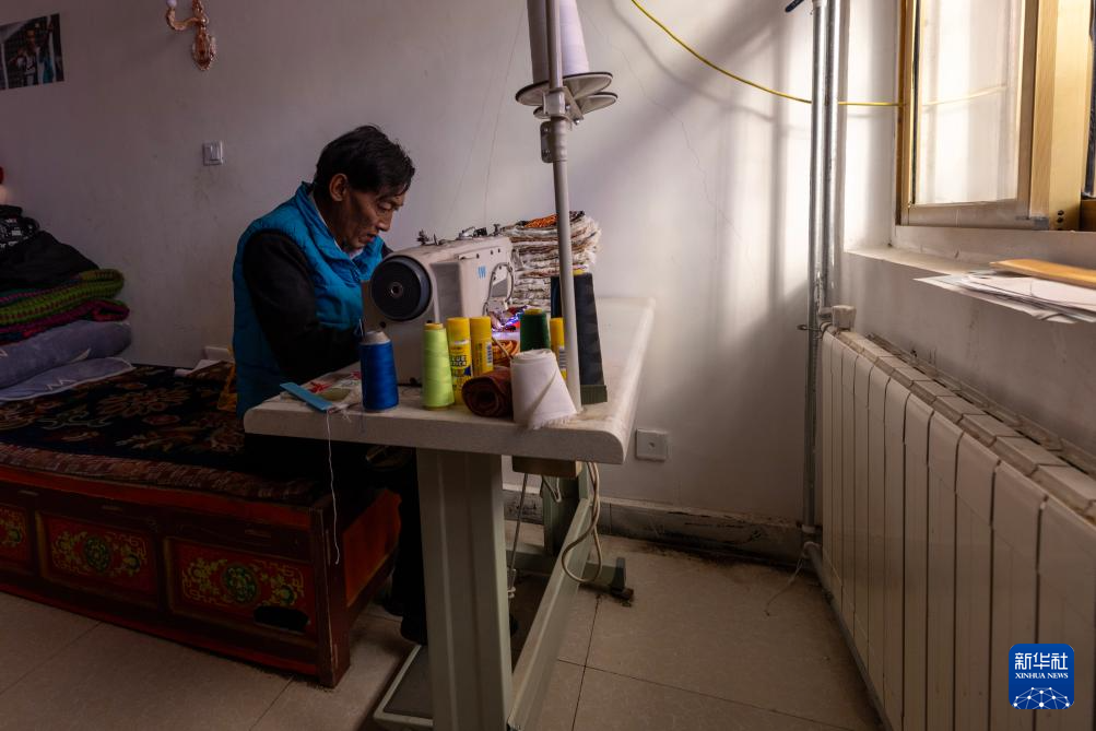 措勤縣扎日南木錯社區(qū)居民林瓊在自家的暖氣房內制作傳統(tǒng)民族帽飾(11月20日攝)。新華社記者 姜帆 攝