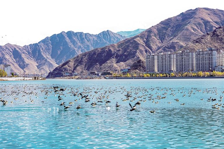 微風(fēng)拂過河面,鳥兒們成群結(jié)伴地飛行,掀起一陣陣鳥浪,場(chǎng)面蔚為壯觀。多年來,西藏始終堅(jiān)持保護(hù)與發(fā)展并重,積極開展生態(tài)保護(hù)。而隨著生態(tài)系統(tǒng)越來越充盈完善,候鳥也越來越多,相關(guān)部門與愛鳥人士均在努力為候鳥創(chuàng)造一個(gè)良好的棲息環(huán)境。