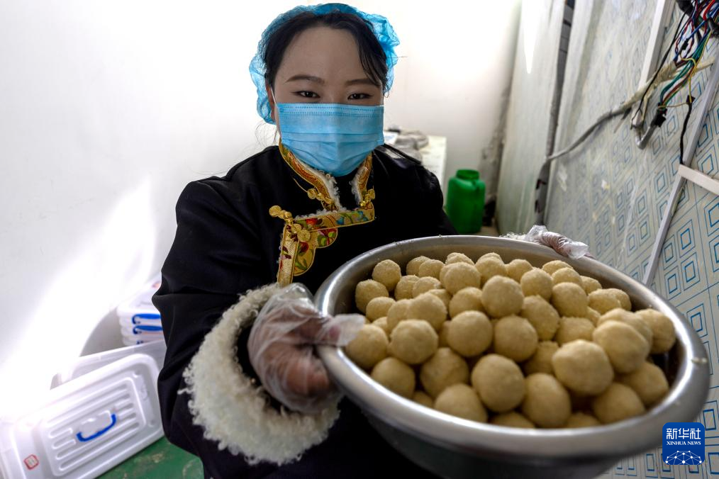 11月28日,在基地就業(yè)的當(dāng)?shù)貑T工索朗卓瑪在用傳統(tǒng)工藝制作奶渣。新華社記者 姜帆 攝