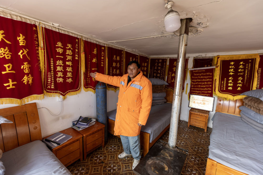 這里的救助站吸引了記者的注意。進入房間,內(nèi)有床鋪、氧氣瓶、抗高反藥等物品,四面墻上掛滿錦旗。一封毛筆書寫的紅底感謝信格外顯眼,信中表達了對地嘎、東力、次仁多吉三名養(yǎng)路工人的感謝。信中寫道:“在那漫長的10個小時里,你們不顧危險和疲憊,想盡辦法讓我脫險。”