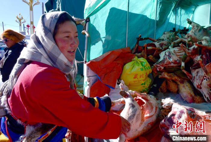 12月6日,西藏自治區(qū)那曲市申扎縣第十八屆畜產(chǎn)品展銷會(huì)現(xiàn)場(chǎng),民眾挑選羊肉。李林 攝