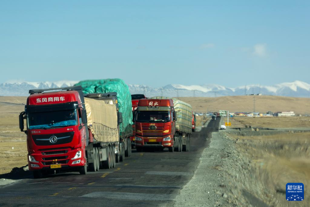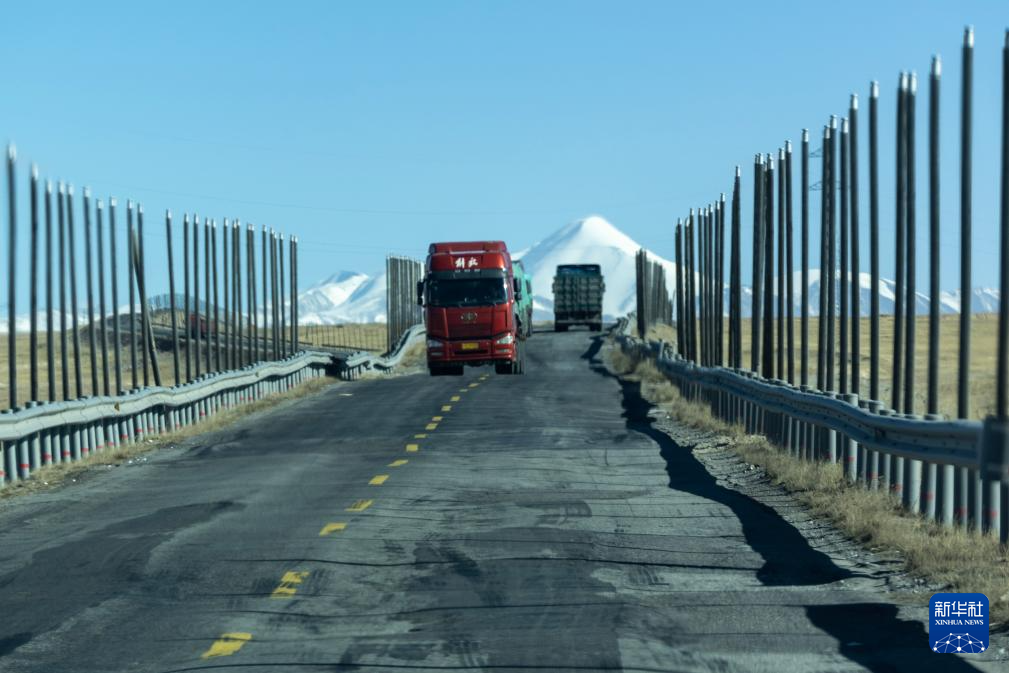 貨車從兩側遍布熱棒的青藏公路一段經過(12月2日攝)。新華社記者 姜帆 攝