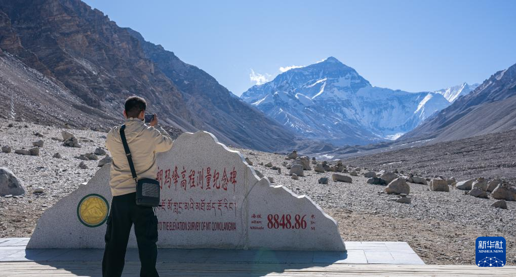 12月14日,游客在珠穆朗瑪峰高程測量紀(jì)念碑旁拍照留念。新華社記者 丁增尼達(dá) 攝