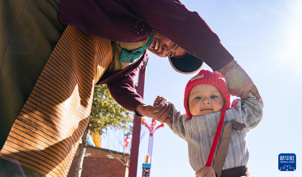 12月15日,達(dá)曼新村的一名婦女在教孩子走路。新華社記者 丁增尼達(dá) 攝
