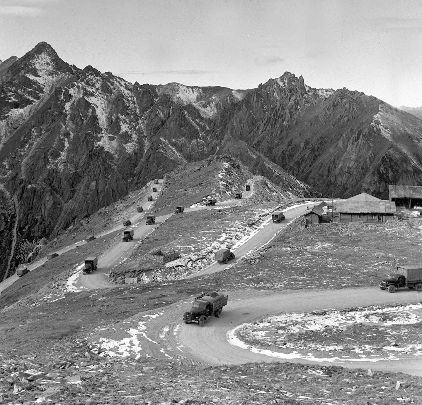 1964年,滿載建設(shè)物資的汽車隊行駛在川藏公路途中的雀兒山上。