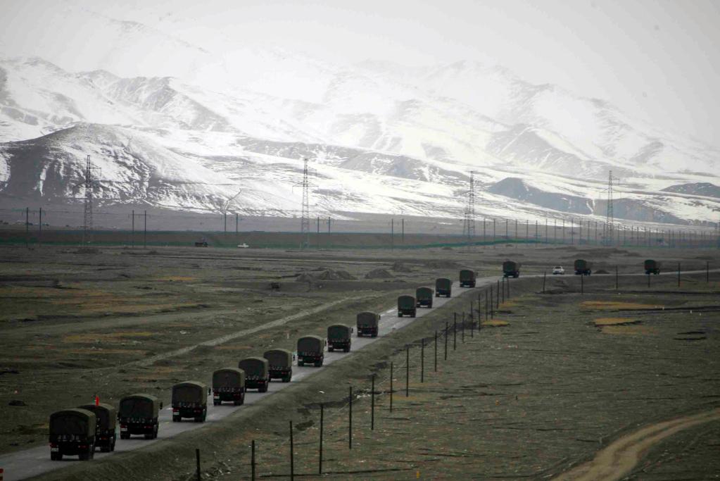 2014年9月24日,運輸車隊行進在青藏公路青海玉珠峰下。