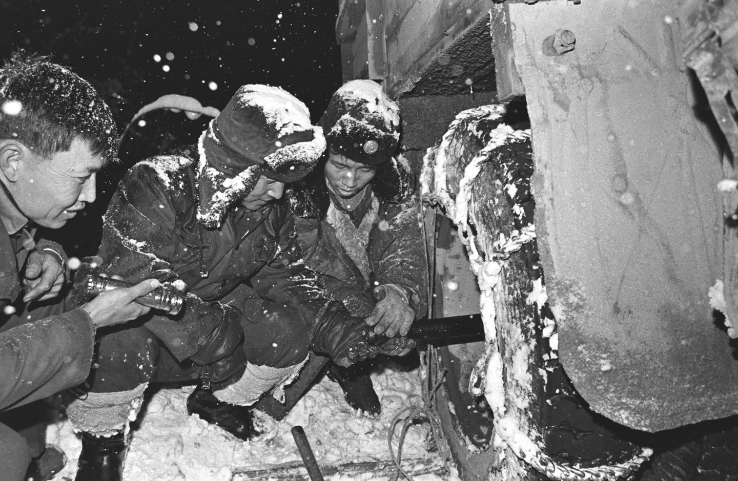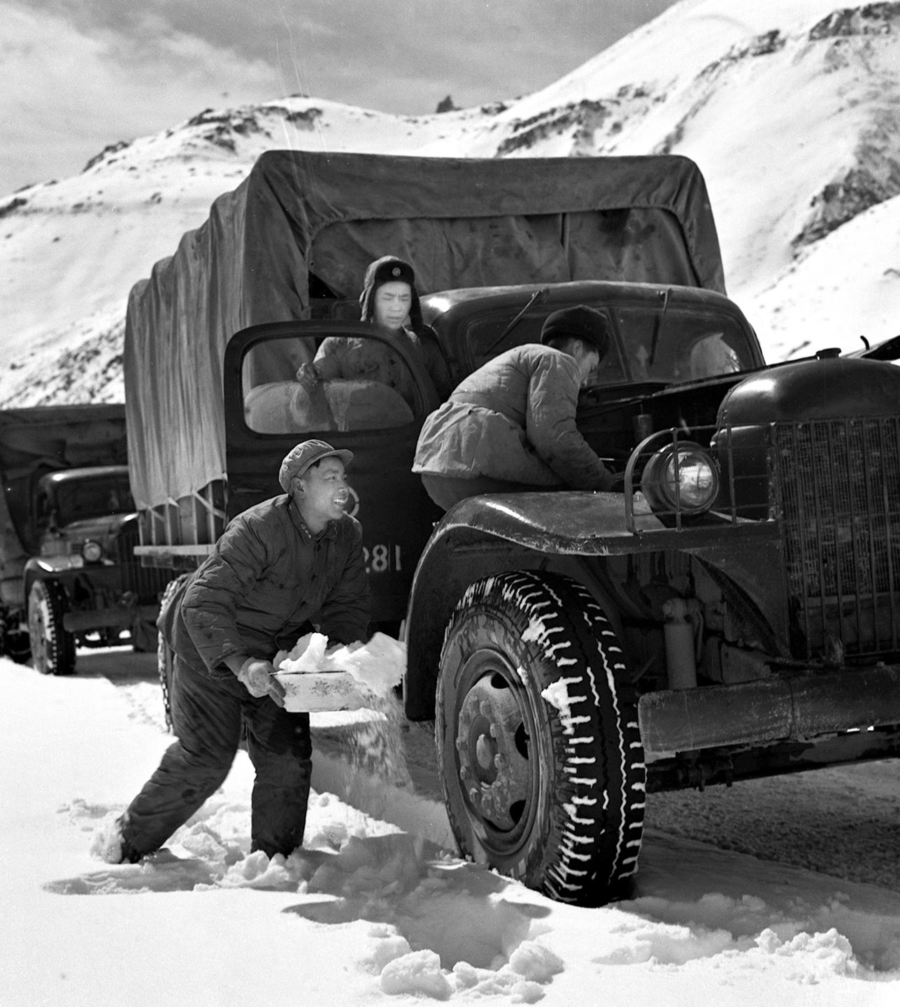 1964年,解放軍一個汽車連隊的駕駛員在川藏公路上用洗臉盆端雪去冷卻油泵。