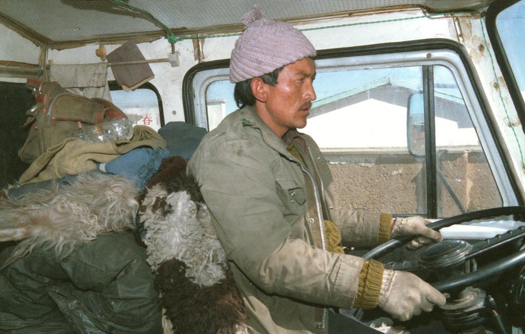 1989年拍攝的長年駕車奔馳在青藏公路上的藏族司機。