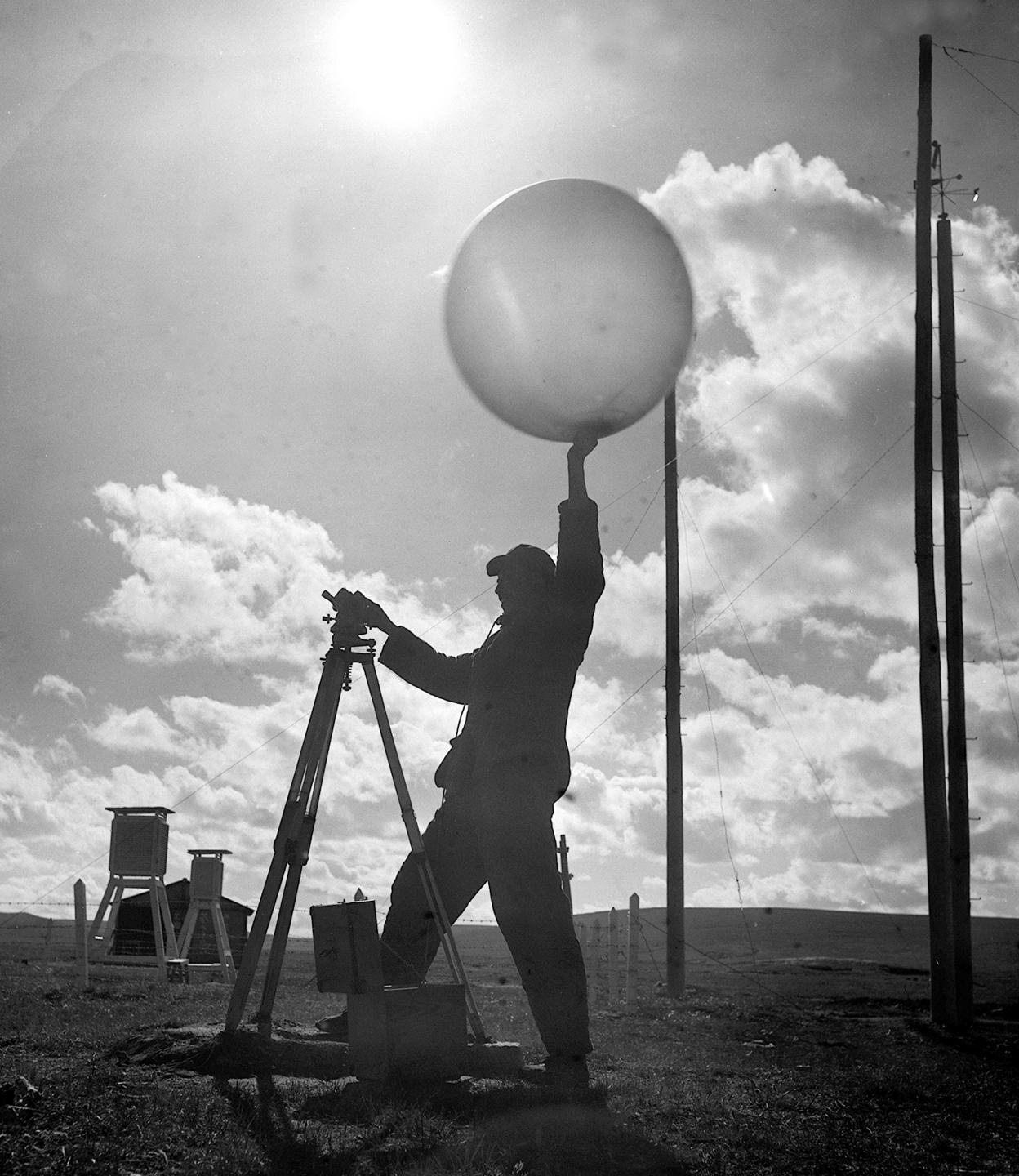 1964年,五道梁氣象服務(wù)站的工作人員放測風氣球。在昆侖山里工作的氣象工作者,長期堅守工作崗位,為青藏公路安全運輸提供了寶貴的氣象資料。