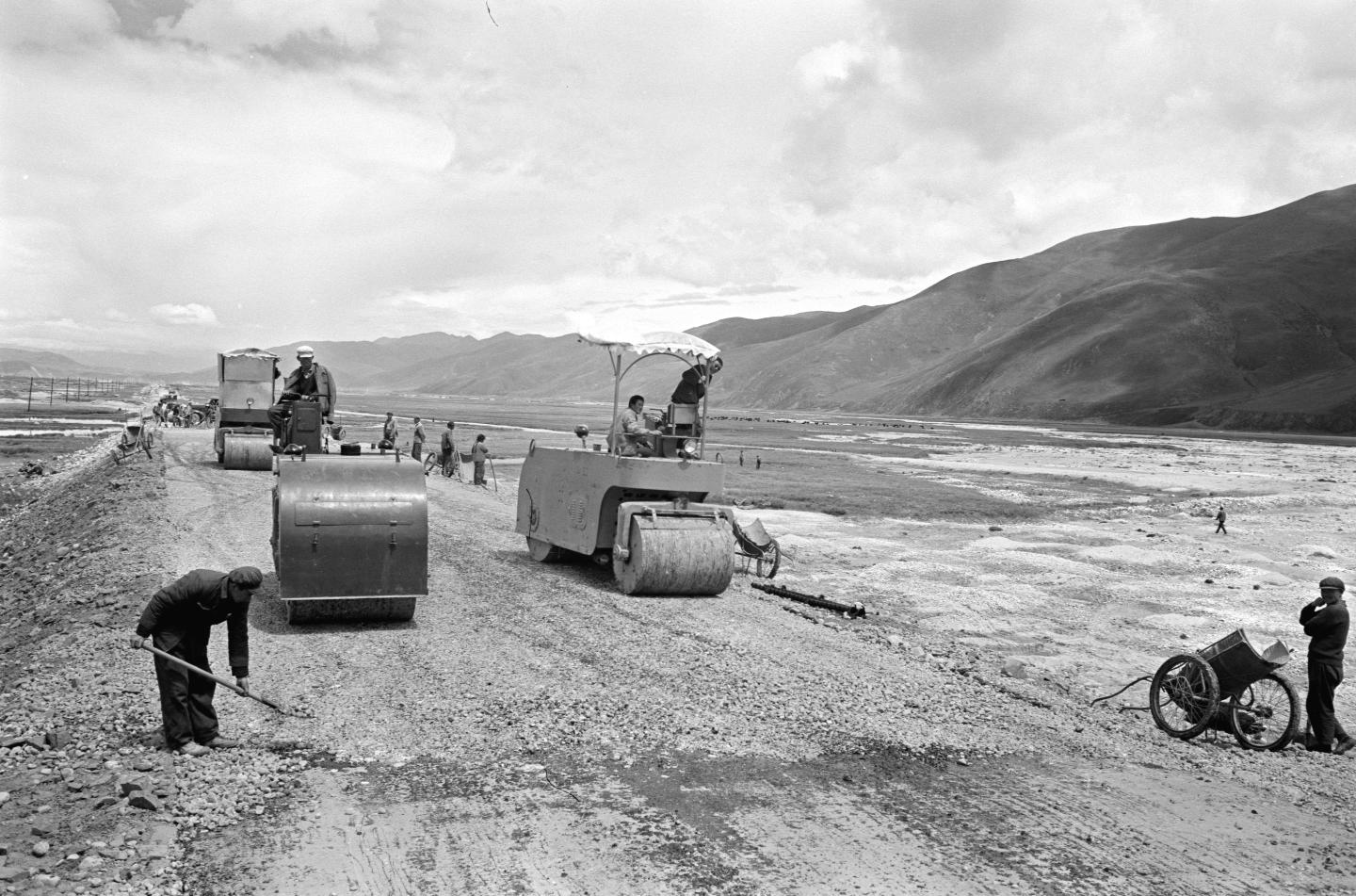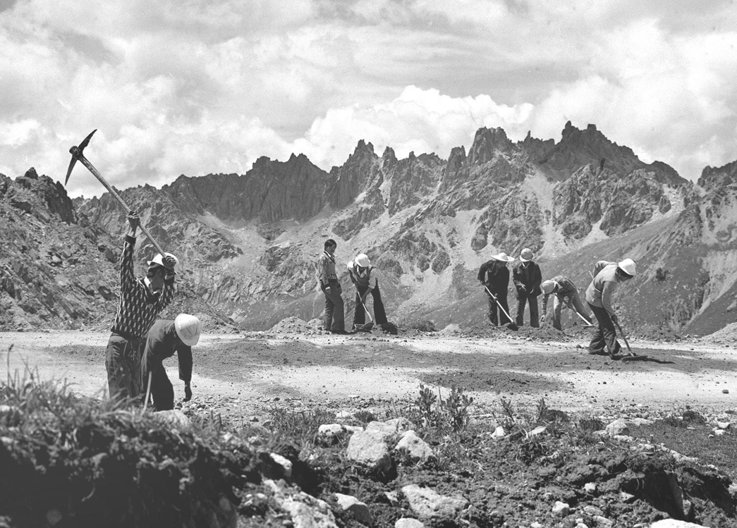 1979年,工人們在藏北高原上施工,為青藏公路鋪設(shè)柏油路面。