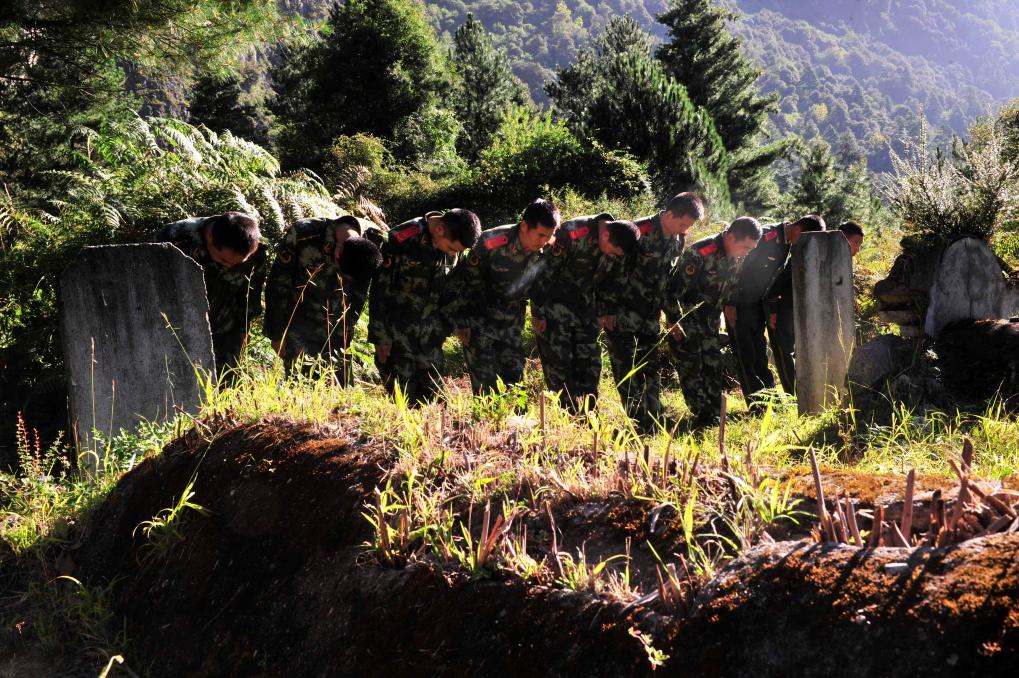2014年9月18日,武警交通二支隊的官兵在波密縣烈士陵園祭奠烈士。在川藏公路沿線的許多地方,都有為當年筑路部隊和當代護路部隊因公犧牲的烈士所建的陵園。
