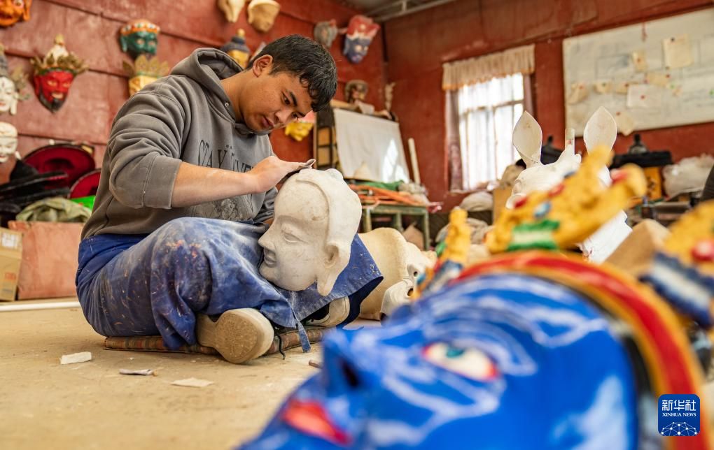 12月9日,拉薩達孜區(qū)雪鄉(xiāng)民間傳統(tǒng)手工藝農(nóng)民專業(yè)合作社的面具制作工匠制作傳統(tǒng)面具。新華社記者 丁增尼達 攝