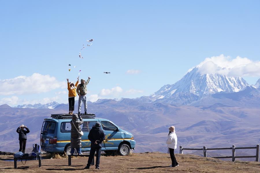 10月28日,游客在八郎生都觀景平臺(tái)拍照,后面是雅拉雪山。新華社記者 胥冰潔 攝
