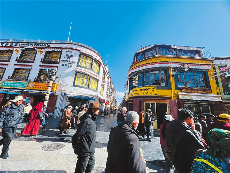 無論春夏秋冬,八廓街始終熱鬧非凡。每年春、夏、秋三季,國內(nèi)外游客紛至沓來;冬季,許多來自邊遠(yuǎn)農(nóng)牧區(qū)的群眾會前來游玩、購買年貨。尤其是2024年“冬游西藏”活動的開啟,更是讓八廓街的人氣爆棚。走進(jìn)八廓街,周邊的藏式特色建筑、琳瑯滿目的民俗風(fēng)情商品、絡(luò)繹不絕的游客,共同構(gòu)成了一幅獨(dú)特而又和諧的畫面。這里商業(yè)與人文并存、傳統(tǒng)與現(xiàn)代交織,游客們既能感受到文化底蘊(yùn),又能享受到現(xiàn)代商業(yè)的便利和多元。