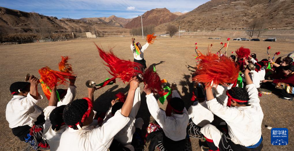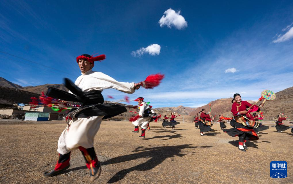 西藏昌都市丁青縣尺犢鎮(zhèn)烏巴村文藝演出隊(duì)在跳熱巴舞(1月5日攝)。新華社記者 丁增尼達(dá) 攝