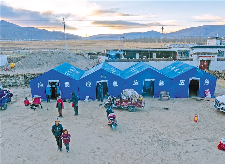 圖為1月7日,在拉孜縣曲下鎮(zhèn)土林村,受災(zāi)群眾搬入應(yīng)急帳篷(無人機(jī)照片)。新華社記者 姜帆 攝