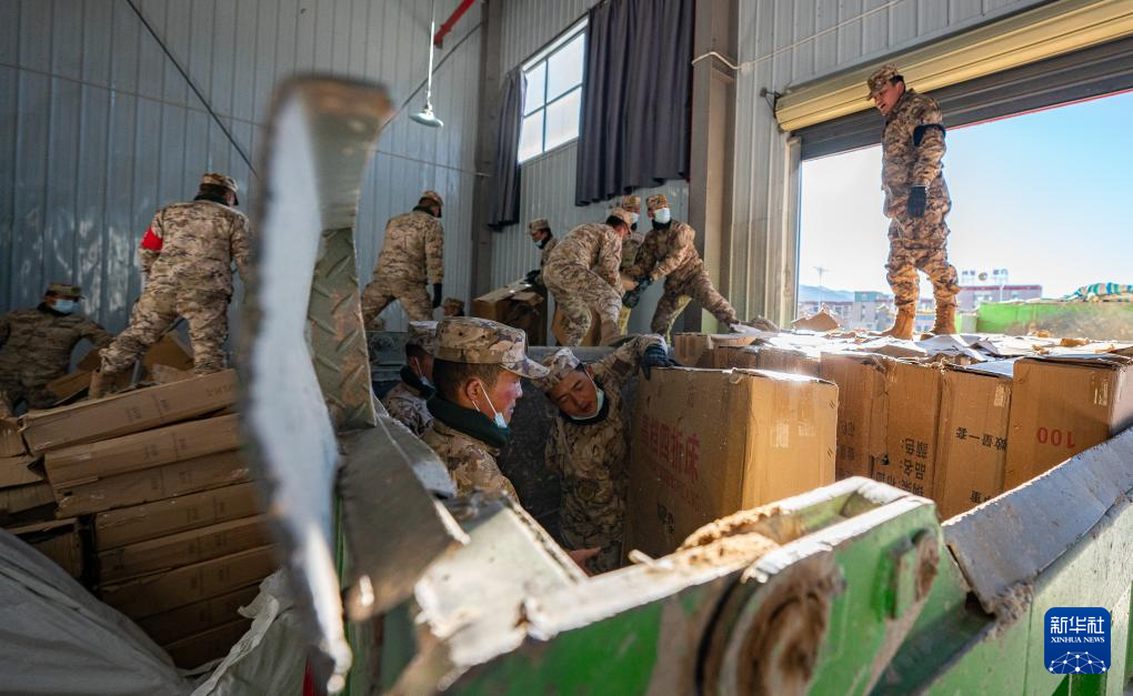 1月8日,在日喀則市經(jīng)開區(qū)物資儲(chǔ)備倉庫,武警官兵在搬運(yùn)抗震救災(zāi)物資。