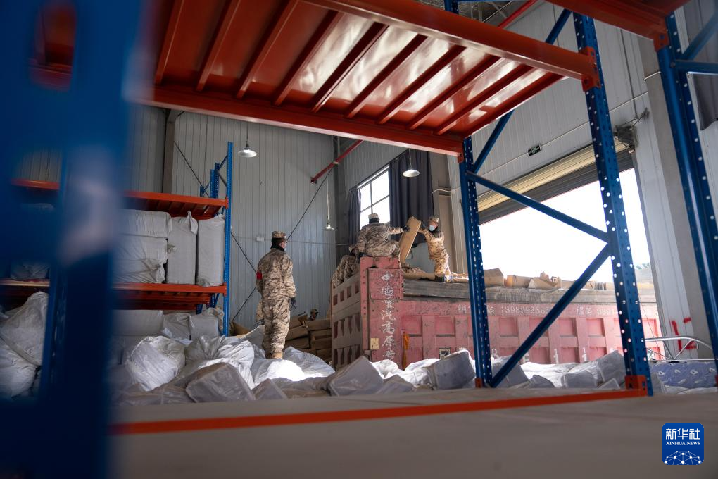 1月8日,在日喀則市經(jīng)開區(qū)物資儲(chǔ)備倉庫,武警官兵在搬運(yùn)抗震救災(zāi)物資。新華社記者 丁增尼達(dá) 攝
