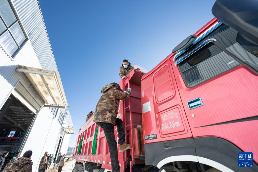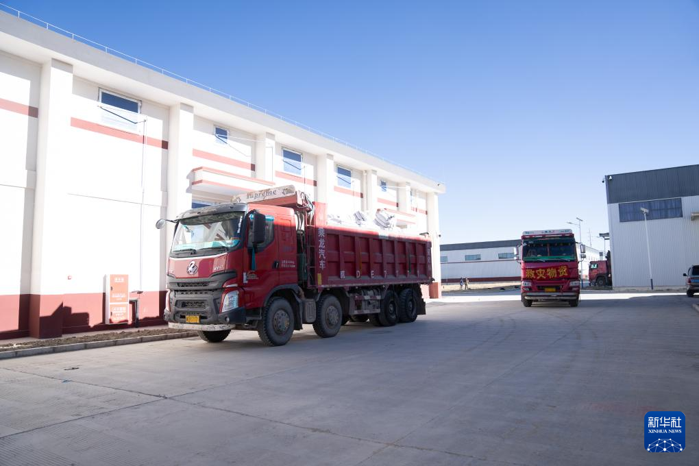 1月8日,在日喀則市經(jīng)開區(qū)物資儲(chǔ)備倉庫,裝好抗震救災(zāi)物資的車輛駛出園區(qū)。新華社記者 丁增尼達(dá) 攝
