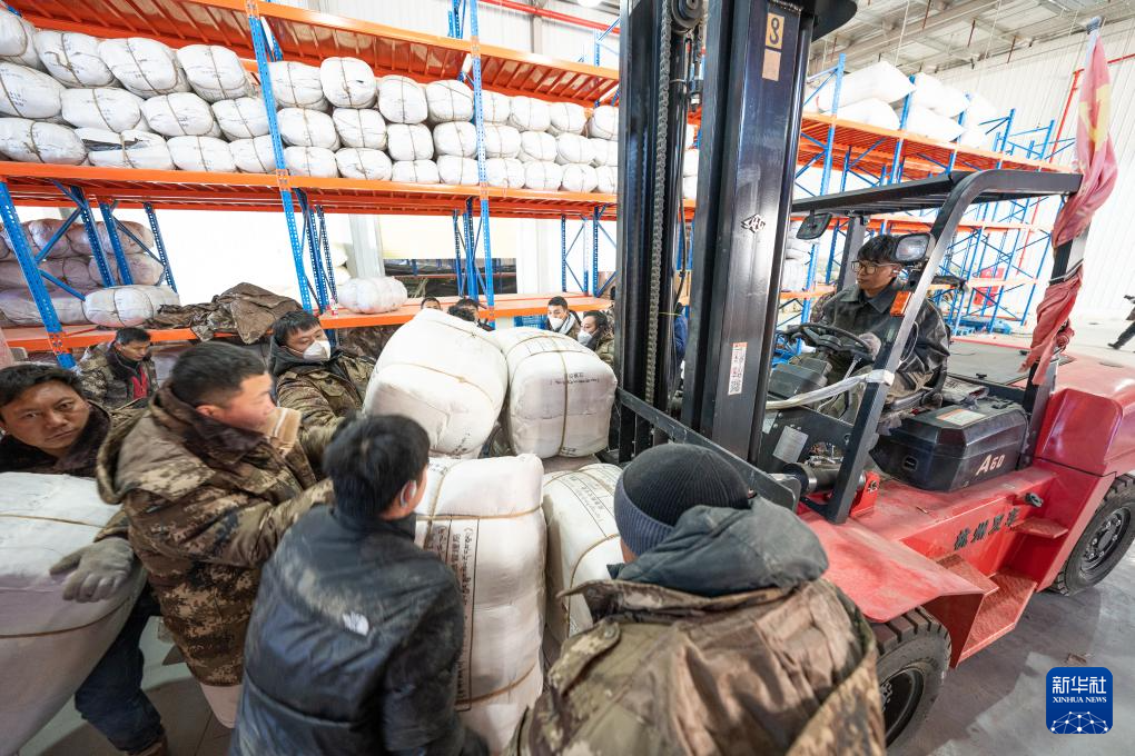 1月8日,在日喀則市經(jīng)開區(qū)物資儲(chǔ)備倉庫,當(dāng)?shù)馗刹咳罕娫诎徇\(yùn)抗震救災(zāi)物資。新華社記者 丁增尼達(dá) 攝