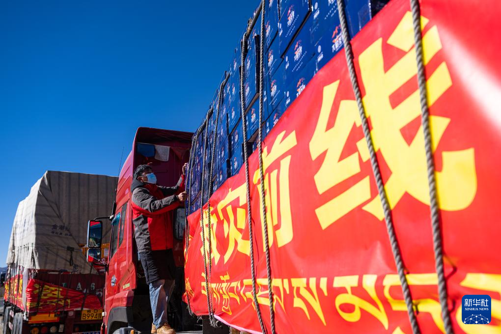 1月8日,在日喀則市境內(nèi)的318國道旁,當(dāng)?shù)仄髽I(yè)工作人員在用繩子固定抗震救災(zāi)物資。新華社記者 丁增尼達(dá) 攝