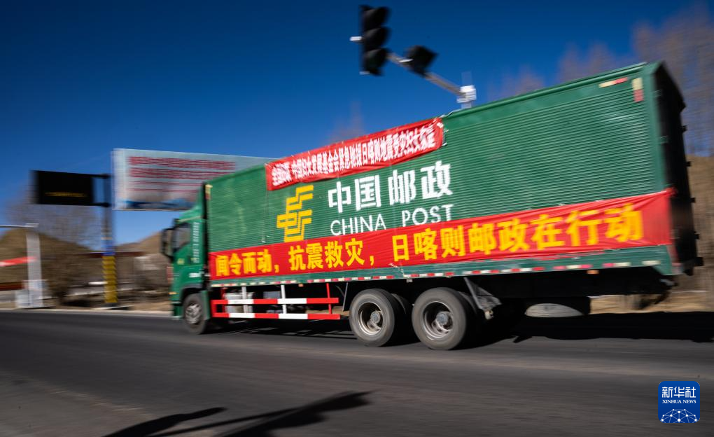 1月8日,在日喀則市境內(nèi)的318國道旁,中國郵政的抗震救災(zāi)物資運(yùn)輸車輛向震中方向駛?cè)?。新華社記者 丁增尼達(dá) 攝