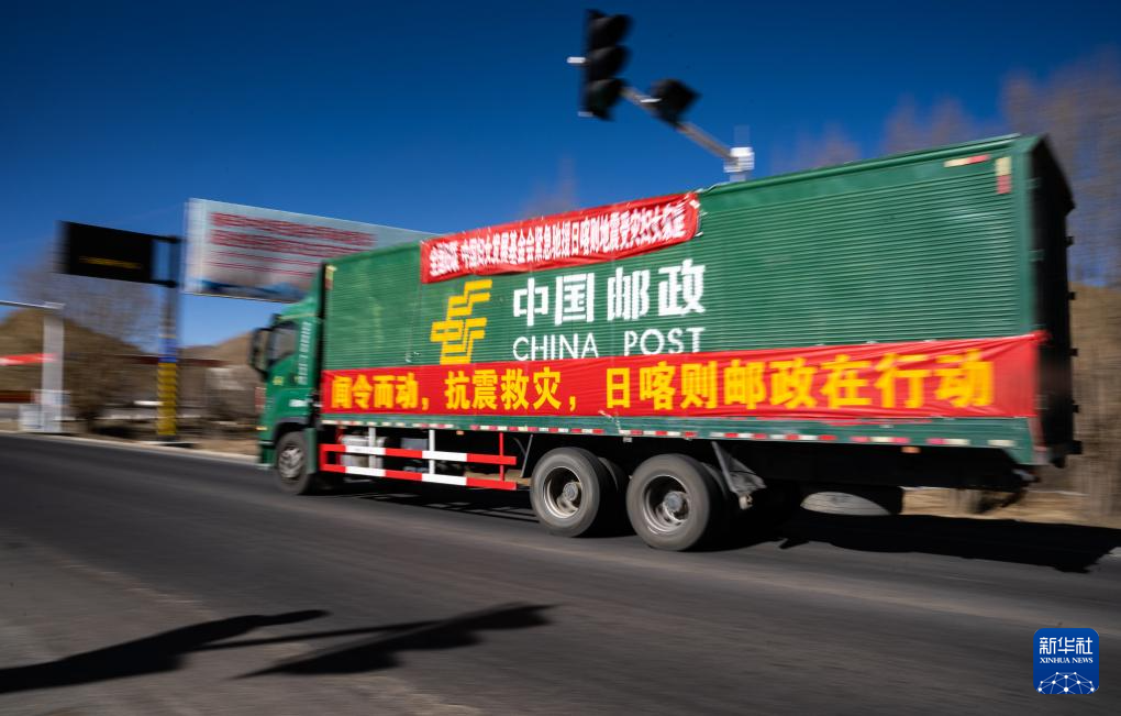 1月8日,在日喀則市境內(nèi)的318國道,中國郵政的抗震救災運輸車輛向災區(qū)方向駛?cè)ァP氯A社記者 丁增尼達 攝