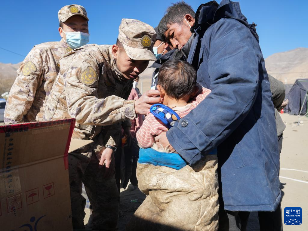 1月8日,在長所鄉(xiāng)森嘎村臨時安置點,西藏軍區(qū)總醫(yī)院醫(yī)療隊隊員為小朋友治療。新華社記者 丁汀 攝