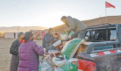 1月8日,在定日縣長(zhǎng)所鄉(xiāng)古榮村安置點(diǎn),志愿者為受災(zāi)群眾發(fā)放物資。人民網(wǎng)記者 翁奇羽攝