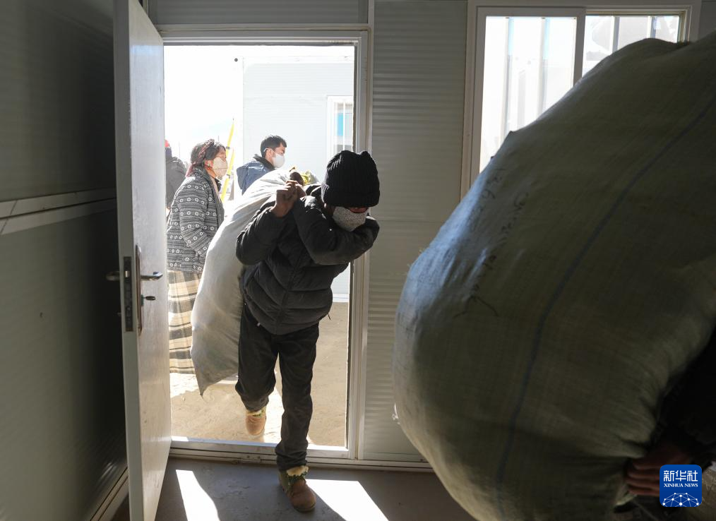 1月10日,在定日縣長所鄉(xiāng)古榮村,受災(zāi)群眾在將帳篷內(nèi)的物資搬入板房。新華社記者 晉美多吉 攝