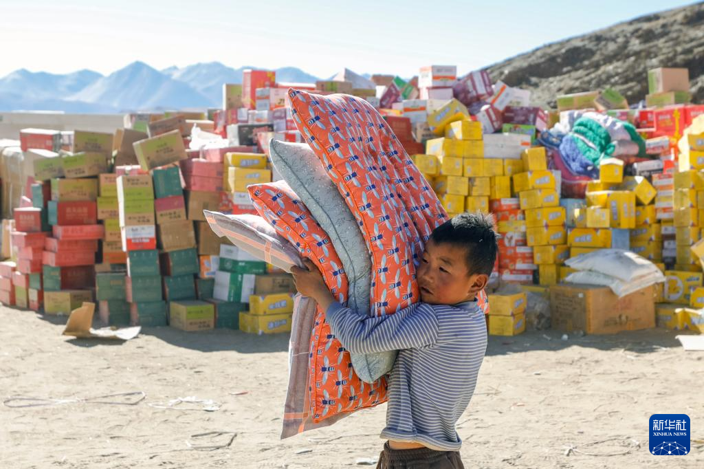 1月10日,在定日縣長所鄉(xiāng)古榮村,受災(zāi)群眾領(lǐng)到生活物資。新華社記者 晉美多吉 攝