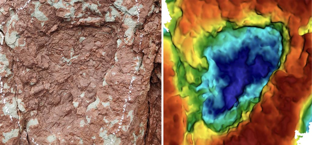 在西藏昌都市凍多村發(fā)現的小型蜥腳類恐龍足跡與3D圖像。(受訪者供圖)