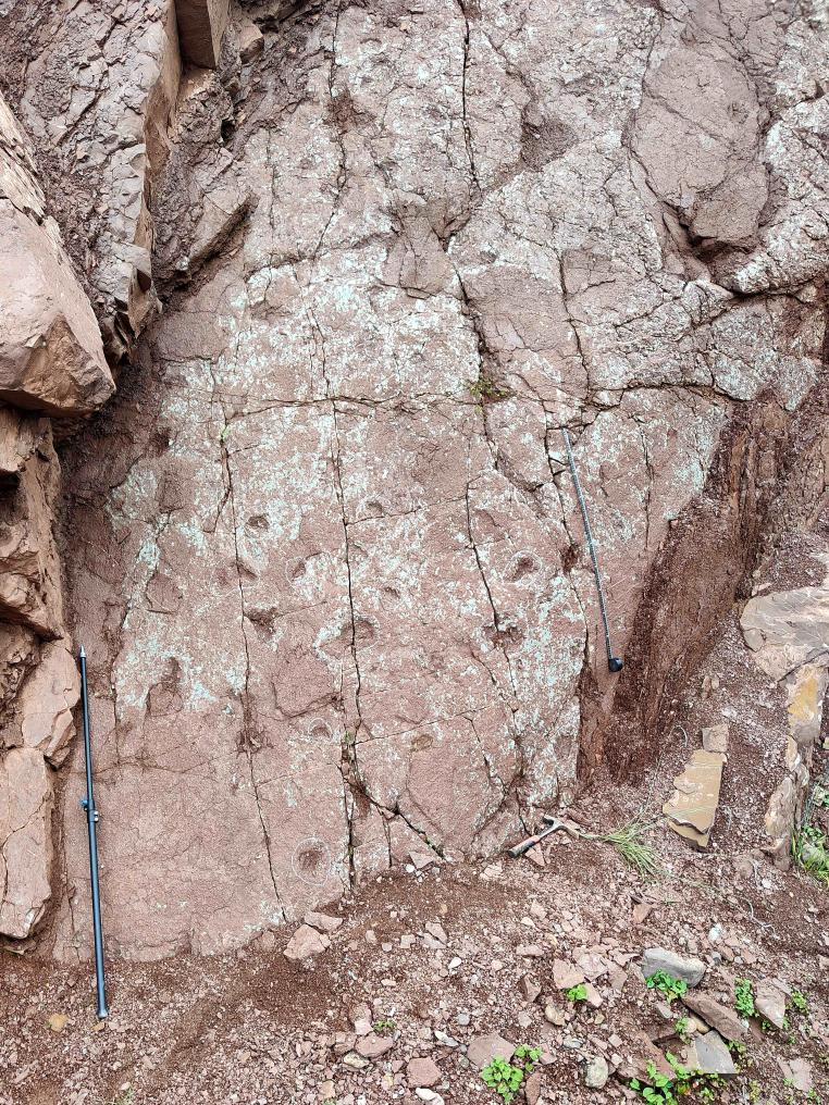 考察隊在凍多村發(fā)現了兩個足跡點。其中一處遺跡化石是尺寸較小、孤立的蜥腳類恐龍足跡,大小從8.8厘米到15.5厘米不等,可能由6只以上恐龍留下。
