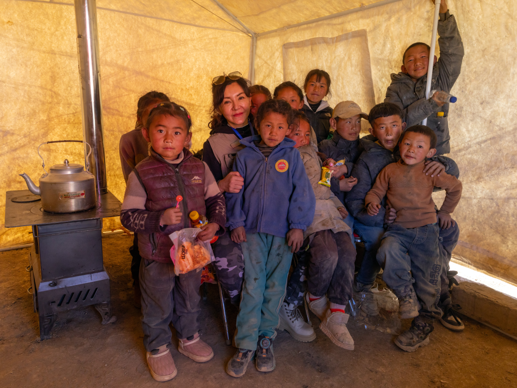 12日上午,西藏定日縣曲洛鄉(xiāng)措昂村的集中安置點(diǎn)里,一群小姑娘圍著一名大姐姐,歡呼雀躍。她們從大姐姐的手里接過(guò)顏料筆、畫(huà)紙、糖果等禮物,咧嘴笑了起來(lái)。