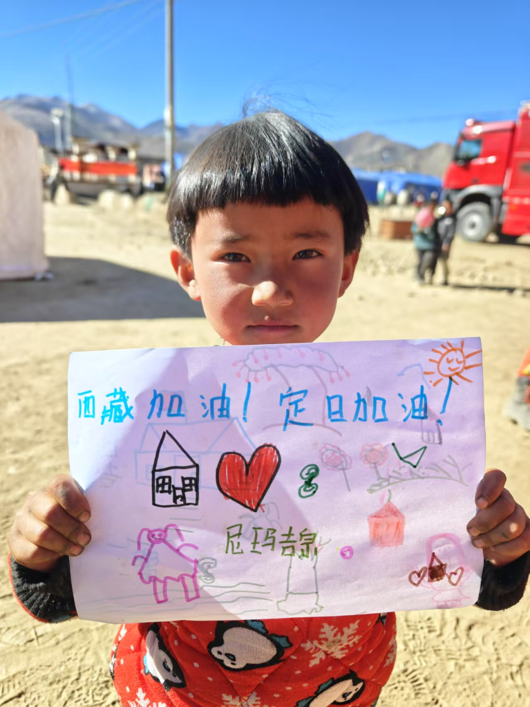 6歲的尼瑪吉宗穿著花棉襖,先畫(huà)了一頂小小的帳篷,在旁邊畫(huà)上了大大的紅心,把梳著羊角辮的自己也畫(huà)上去,天空畫(huà)上了太陽(yáng)。她想了想,工工整整地寫(xiě)上:“西藏加油!”“定日加油!”
