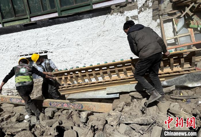 圖為退役軍人志愿者幫助災(zāi)民清理倒塌的雜物。云丹平措 供圖