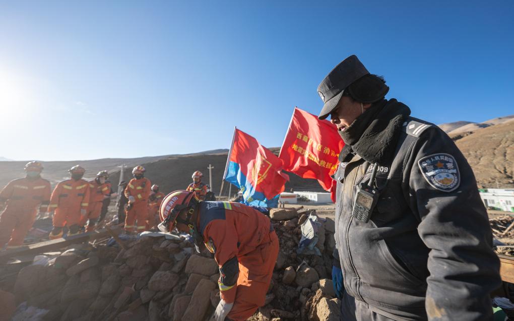1月13日,在定日縣長所鄉(xiāng)古榮村,邊巴桑珠(右一)在指揮房屋廢墟清理工作。新華社記者丁增尼達(dá) 攝