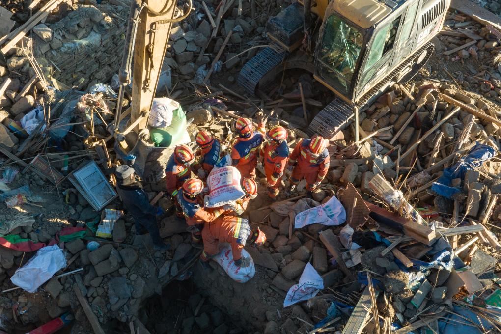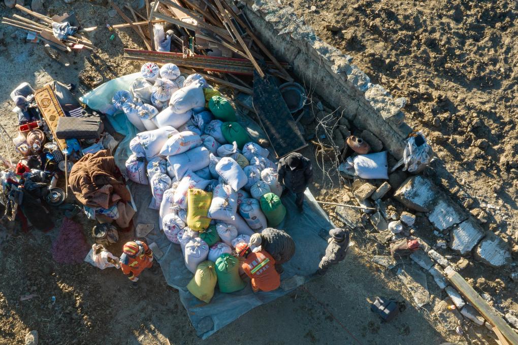 1月13日,在定日縣長所鄉(xiāng)古榮村,消防員們?cè)诎徇\(yùn)從廢墟中搶救出的青稞(無人機(jī)照片)。新華社記者丁增尼達(dá) 攝