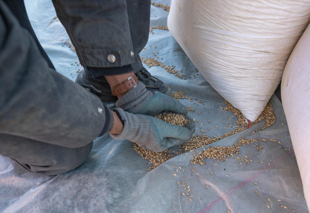 1月13日,在定日縣長所鄉(xiāng)古榮村,公安干警用手捧起灑在地上的青稞。新華社記者丁增尼達(dá) 攝