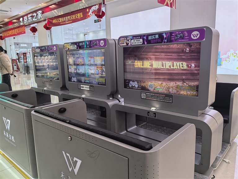 在拉薩市城關(guān)區(qū)北城新天地購物中心,一排自助游戲機吸引了記者的注意。這些游戲機配備了皮質(zhì)沙發(fā)和寬大屏幕,還有經(jīng)典游戲手柄,瀏覽屏幕可以發(fā)現(xiàn)《街頭霸王》《荒野大鏢客》《實況足球》《JUMP FORCE》等熱門游戲。通過掃描屏幕上的二維碼,即可選擇不同的充值套餐,即:15分鐘18至20元,30分鐘28至30元,一個小時48至50元,兩個小時68至70元。部分游戲機還有充卡額外贈送金額的套餐活動,贈送金額從30至500元不等。