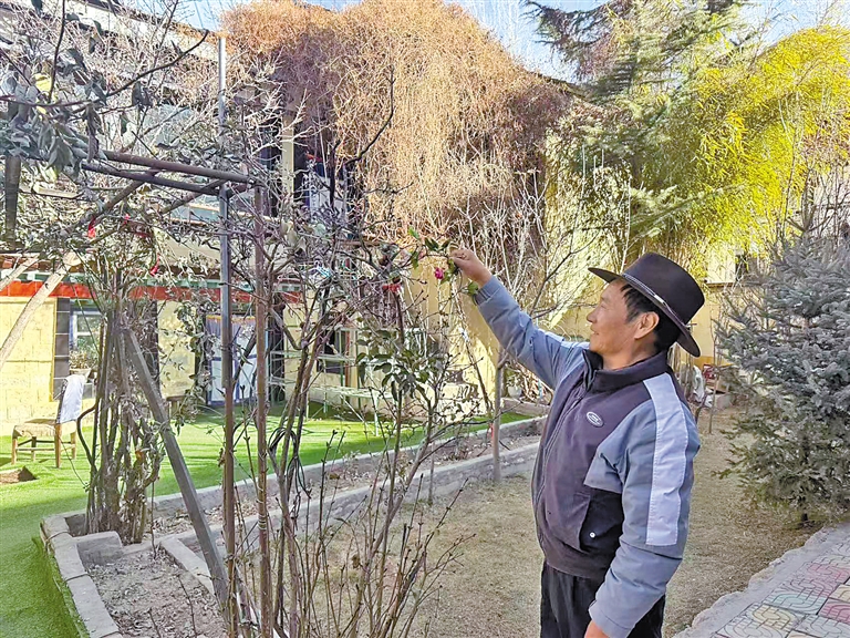 拉薩市城關區(qū)慈覺林村村民次頓珠在清理院子里的月季樹枝。記者 文鳳 攝