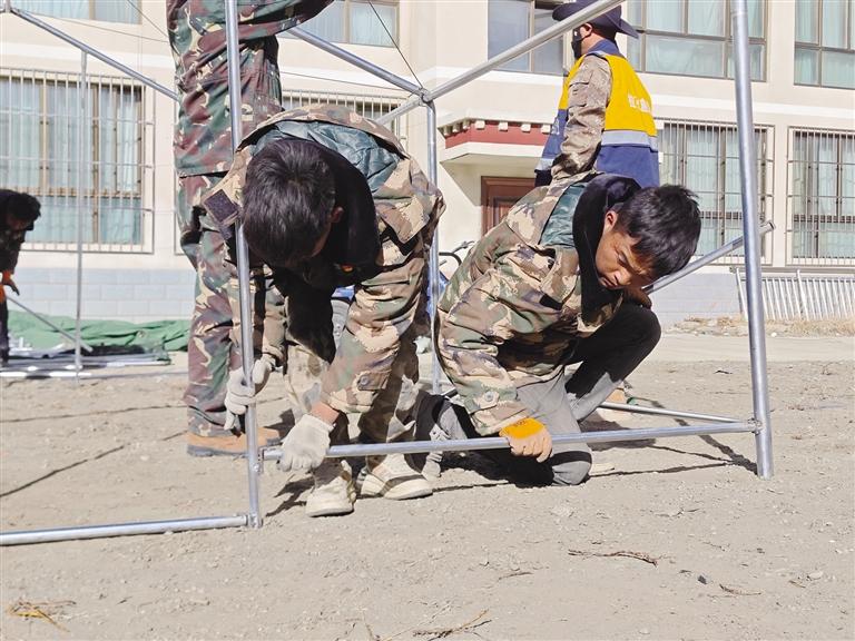 來自日喀則市江孜縣的次仁加措,雖然年僅23歲,眼神中透露出一種不容置疑的堅定。他一邊熟練地搭著帳篷,一邊說:“我們是軍人,哪怕退伍了,這份責任也永遠在肩上。”一旁,普瓊達瓦正在卸載著救援物資,汗水從他的額頭滑落到塵土中。次仁旺加和邊巴扎西則在一旁協(xié)助搭建帳篷。他們的雙手早已磨出了紅印,但手中的活卻一刻也沒有停下。