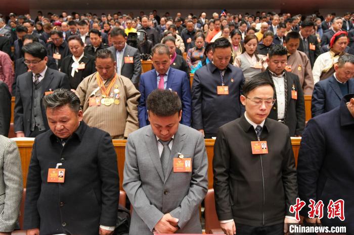 圖為19日開(kāi)幕式上,西藏自治區(qū)人大代表和列席的政協(xié)委員集體為定日縣地震遇難同胞默哀。記者 江飛波 攝
