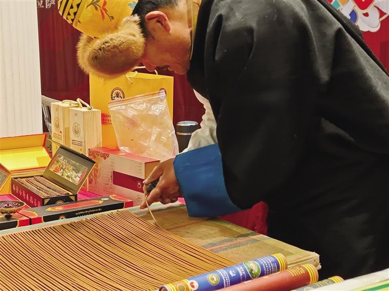 藏香制作技藝是西藏尼木縣吞巴鄉(xiāng)的傳統(tǒng)技藝,2008年被列入第二批國家級(jí)非物質(zhì)文化遺產(chǎn)名錄。藏香由多種名貴藥材配制,制作工藝復(fù)雜,需經(jīng)研磨、攪拌、熬煮、晾曬等步驟。其香氣濃郁持久,燃燒煙霧少,還有安神清心、健脾等藥用功效。游客劉先生買了兩袋藏香,他表示:“這是我第二次來西藏,上次帶回去的藏香很喜歡,這次特意來買。沒想到遇上展銷,太幸運(yùn)了!”