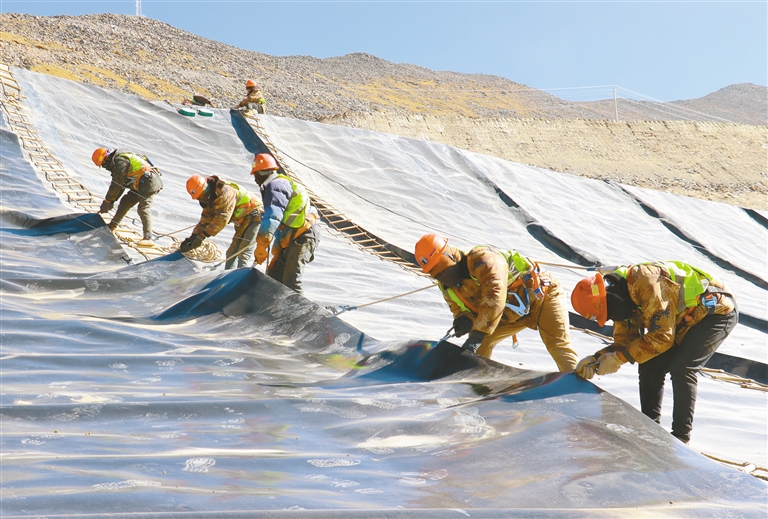中鐵十七局集團(tuán)第二工程有限公司西藏巨龍德慶普項目現(xiàn)場工人正在拉薩市達(dá)孜區(qū)海拔5000米以上的施工區(qū)域進(jìn)行鋪膜防滲作業(yè)。